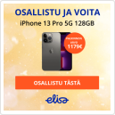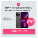Yhteystietonsa jättäneiden kesken arvotaan tyylikäs iPhone 13 Pro 5G 128 GB -älypuhelin. Palkinnon arvo on reilu 1000 euroa. Arvontapäivä 31.5.2022 eli kesällä on 1 onnettaren suosikilla uusi puhelin jo käytössä ja ominaisuuksia pääsee tutkimaan. |